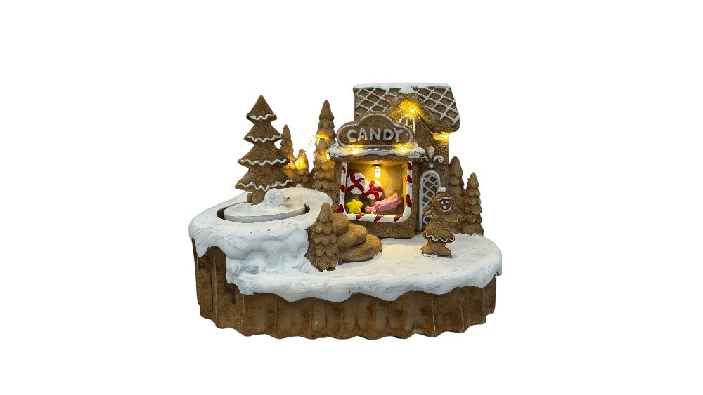 Mézeskalács dizajnú édességbolt, LED-es fényekkel, forgó fenyőfával.