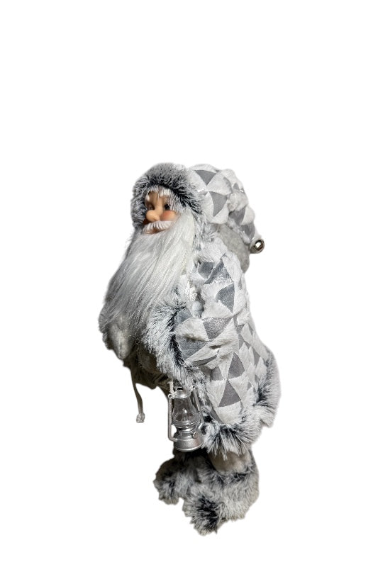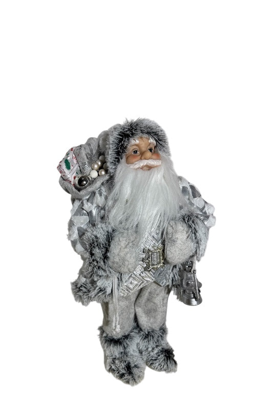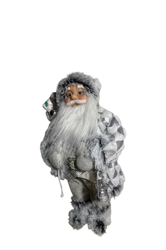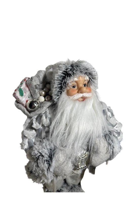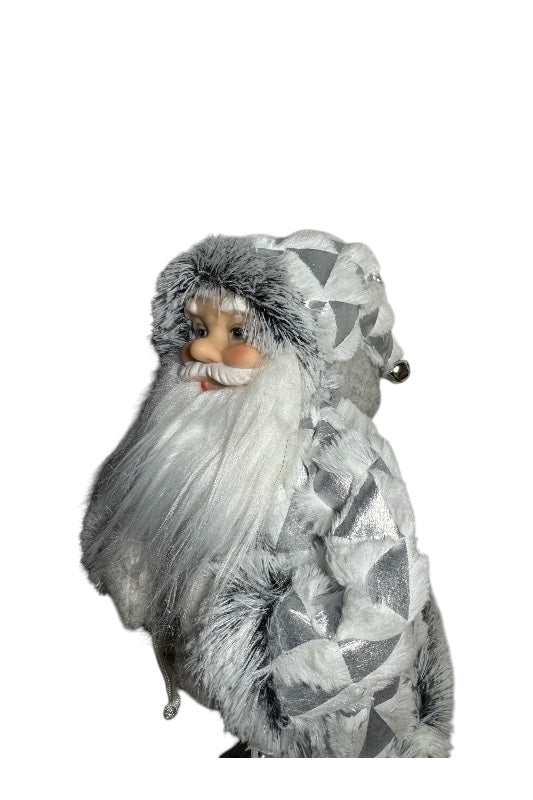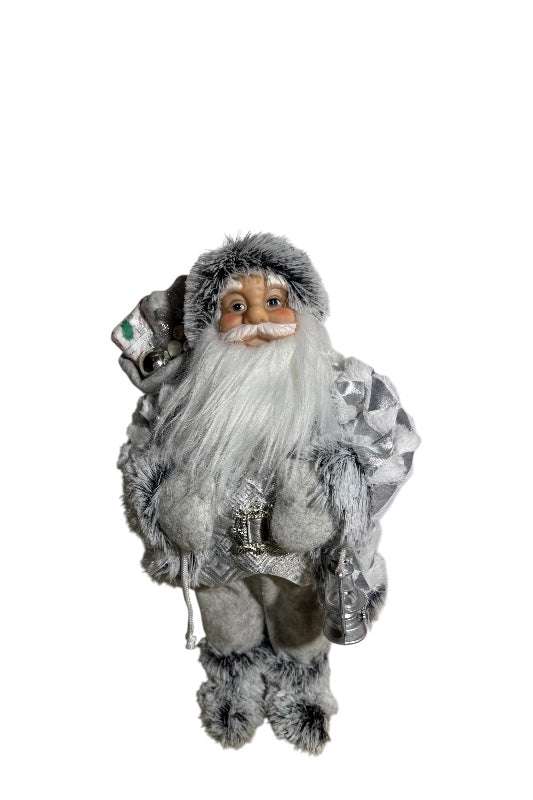 Ezüst-fehér színekben pompázó, 46 cm magas álló Mikulás figura.